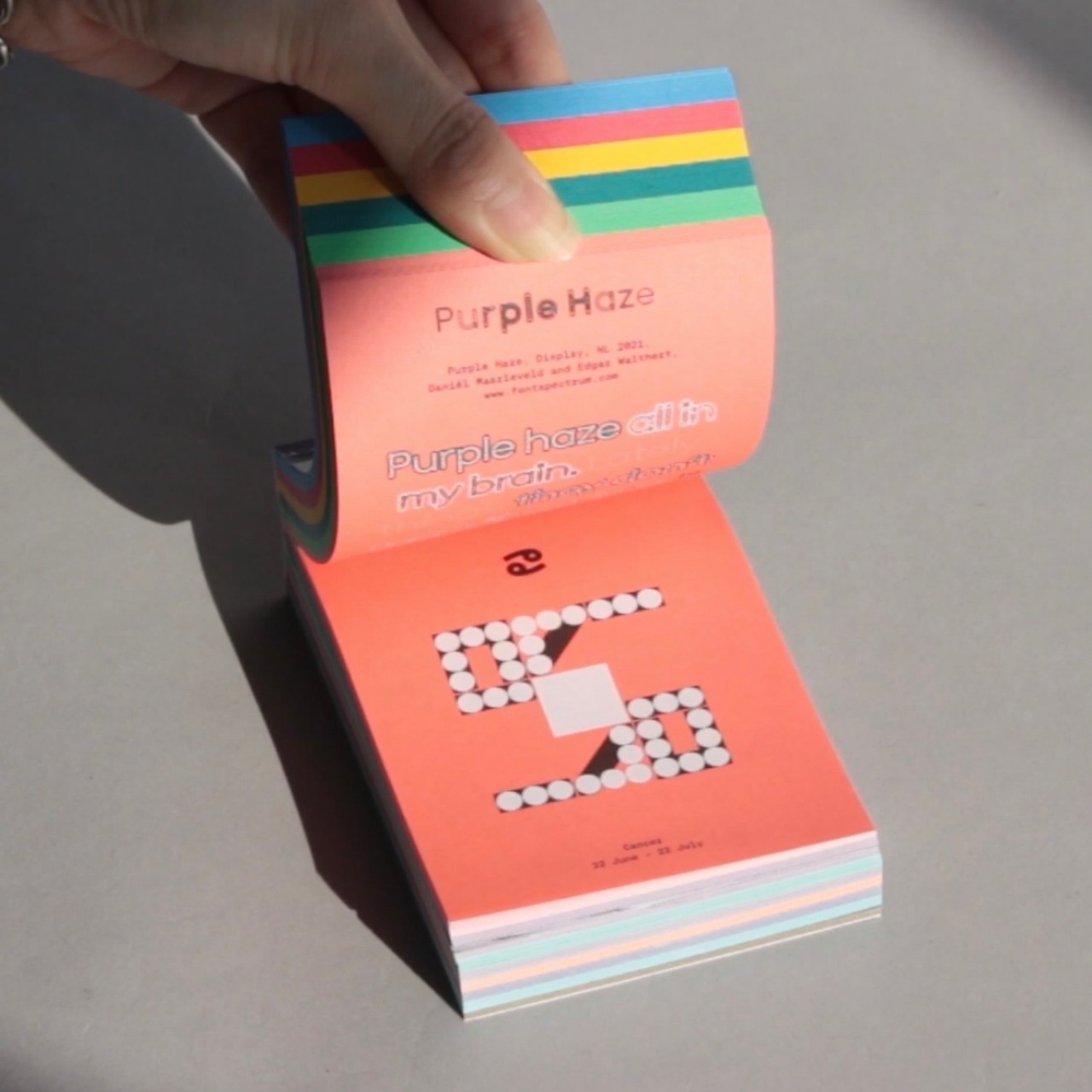 クラシックなセリフ体から筆記体、サイケデリックな飾り文字までさまざまなタイポグラフィで構成され、各ページの裏面には使用されたフォントの名称とサンプルの文字列、そのフォントデザイナーのWebサイトURLを記載。