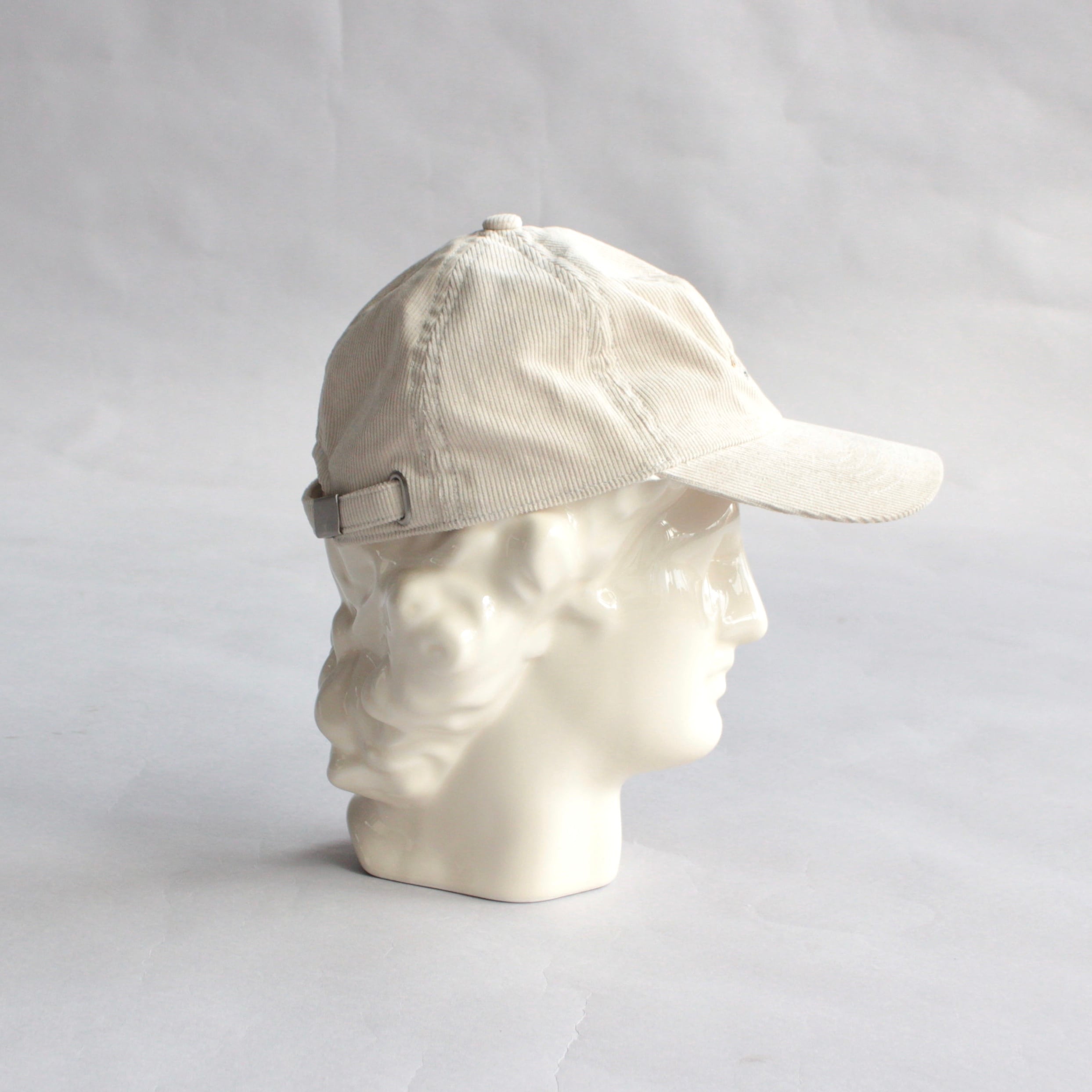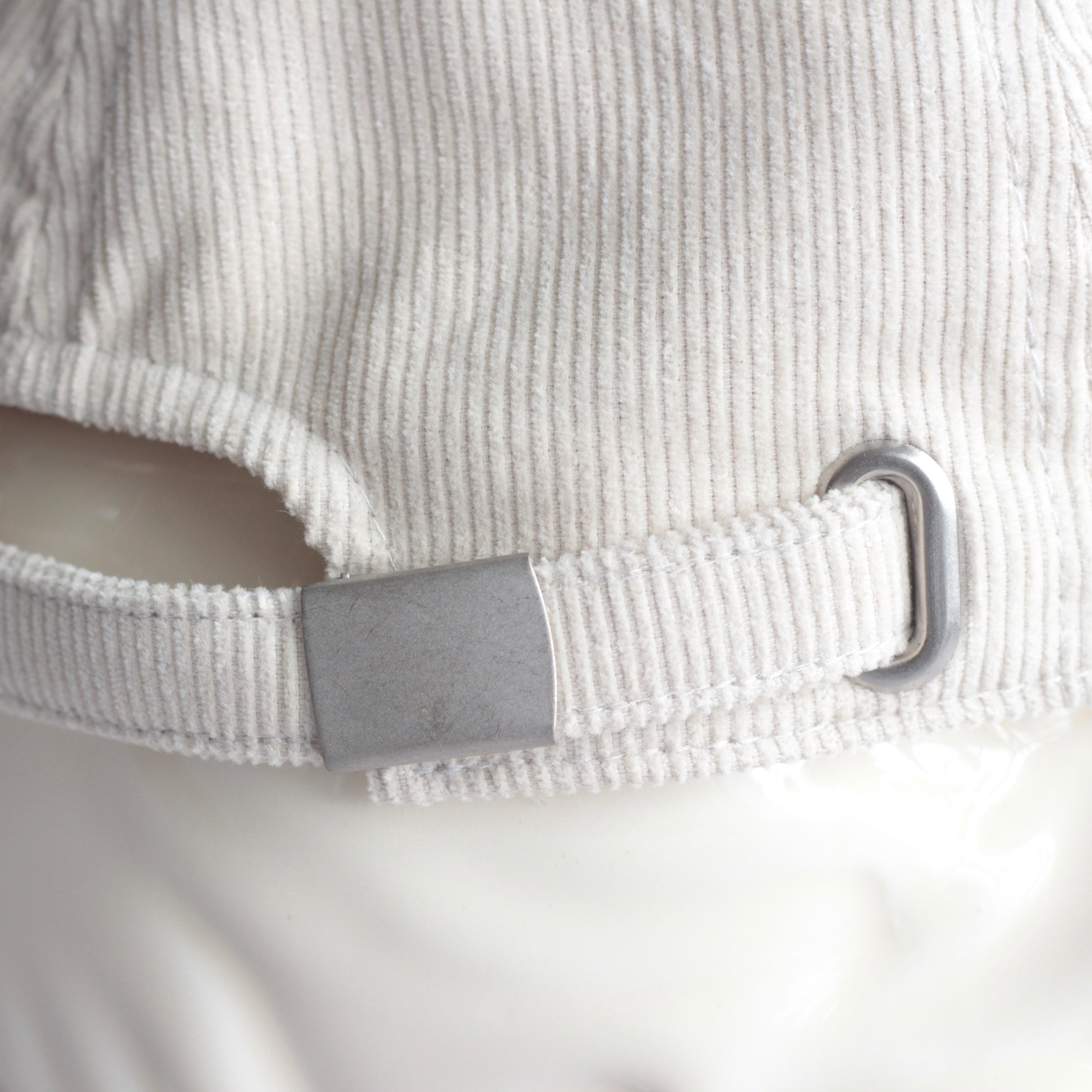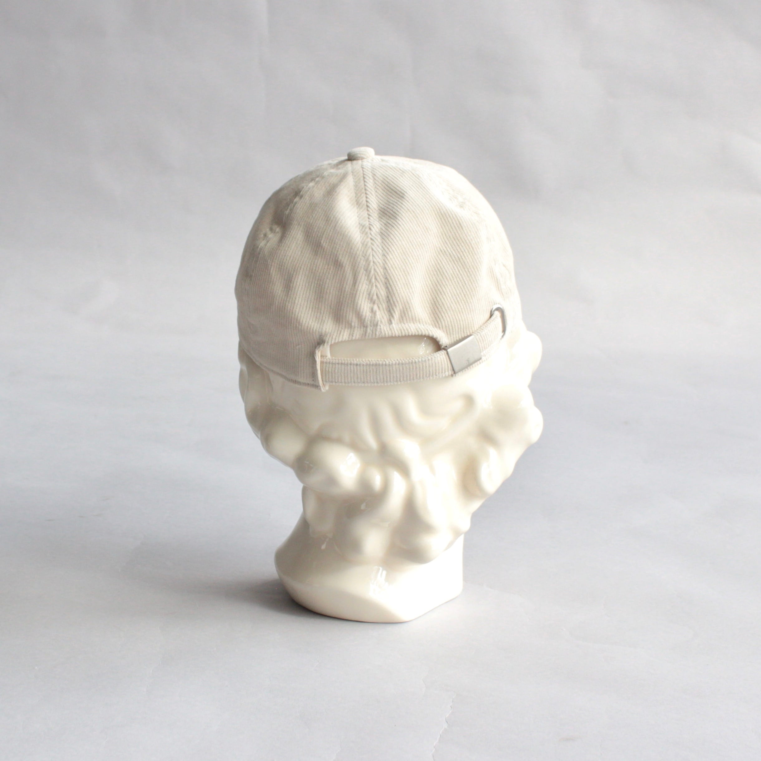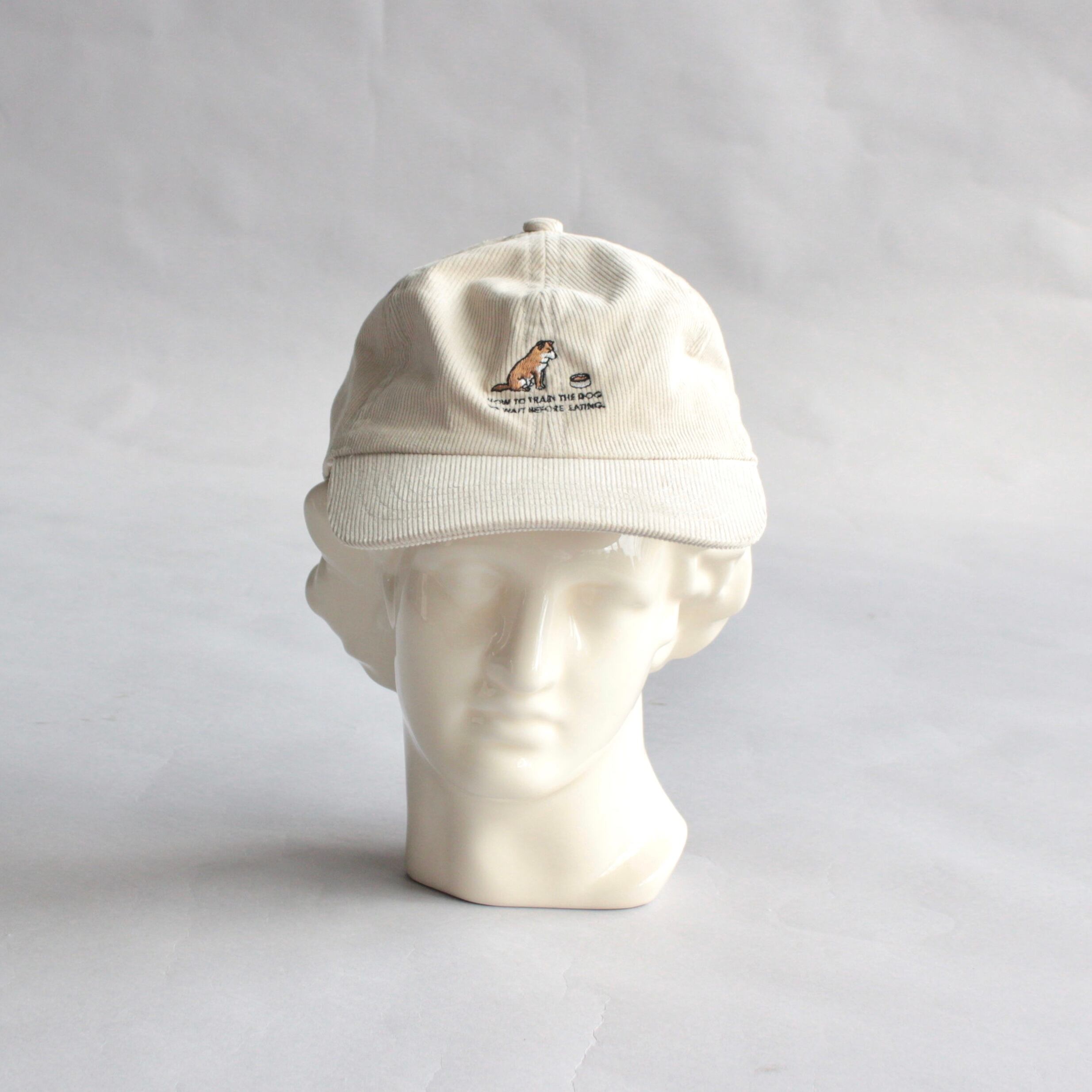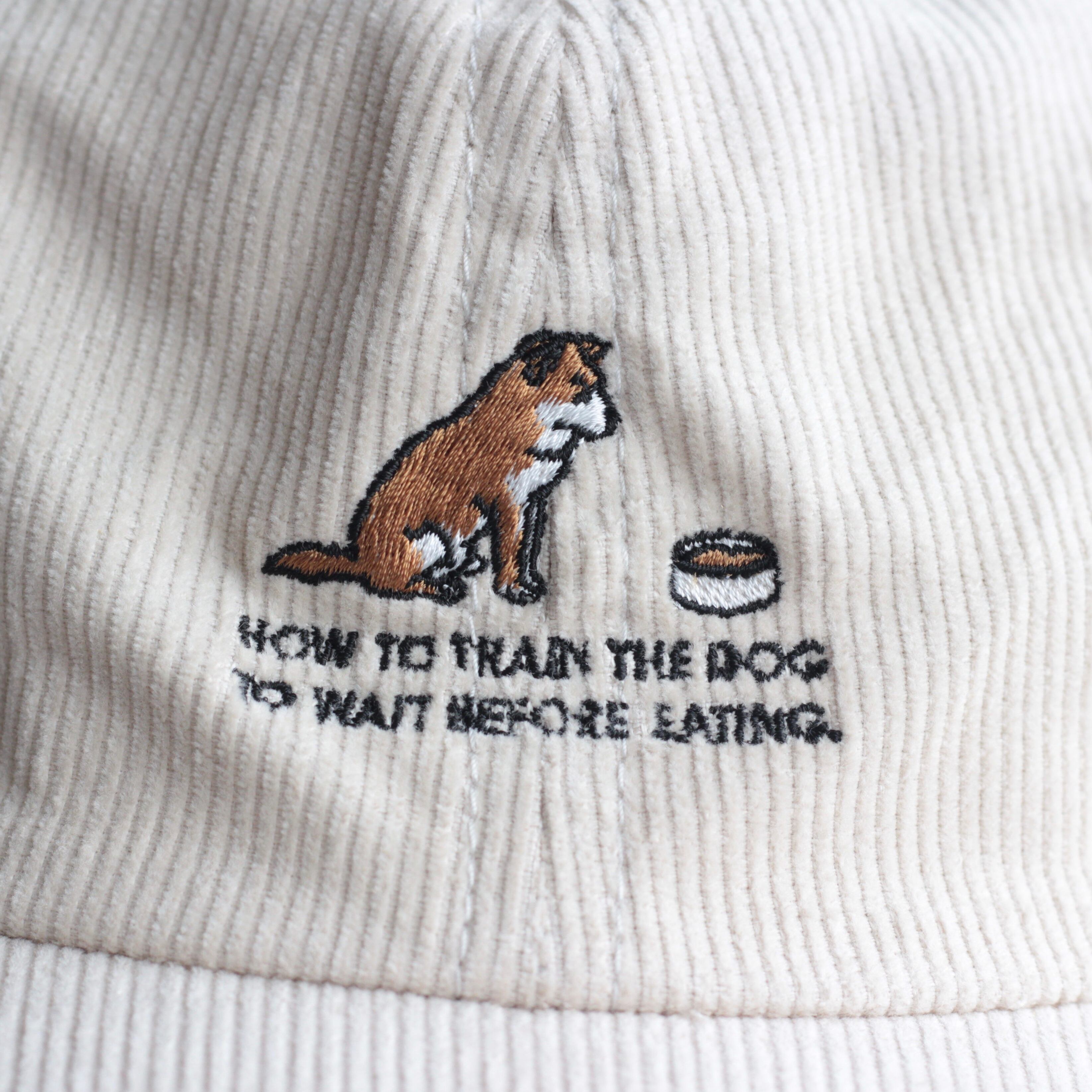 フードを前に「待て」のトレーニングをしているシバ犬の姿を刺繍したキャップ。